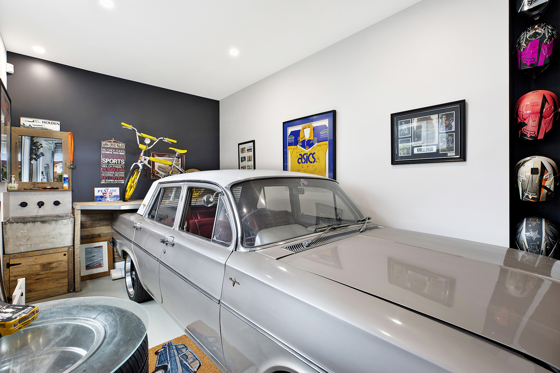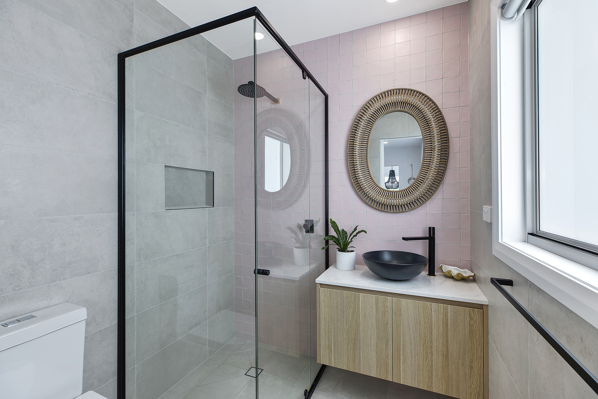 - Crafting a home that maximises both curb appeal and internal comfort required careful planning. Integrating unique client requests, such as a dedicated custom garage/man cave, a lavish outdoor entertaining area with a pool, and distinctive interior design choices like the pink-tiled bathroom and open-plan kitchen/dining with custom lighting, demanded meticulous attention to detail and coordination. Ensuring these diverse elements harmonised within the overall aesthetic was key.