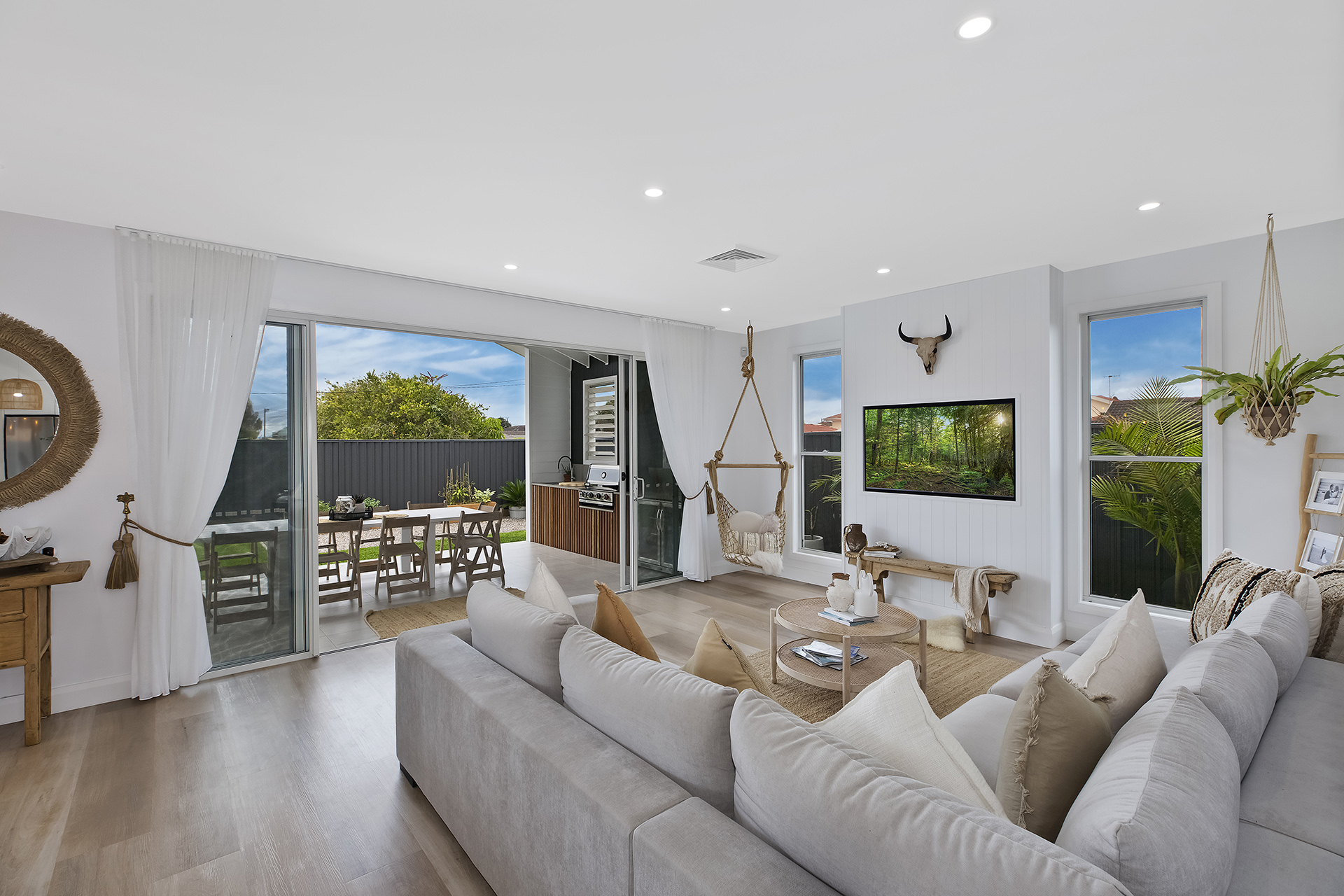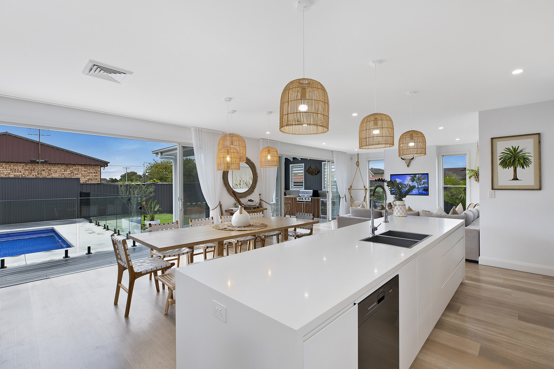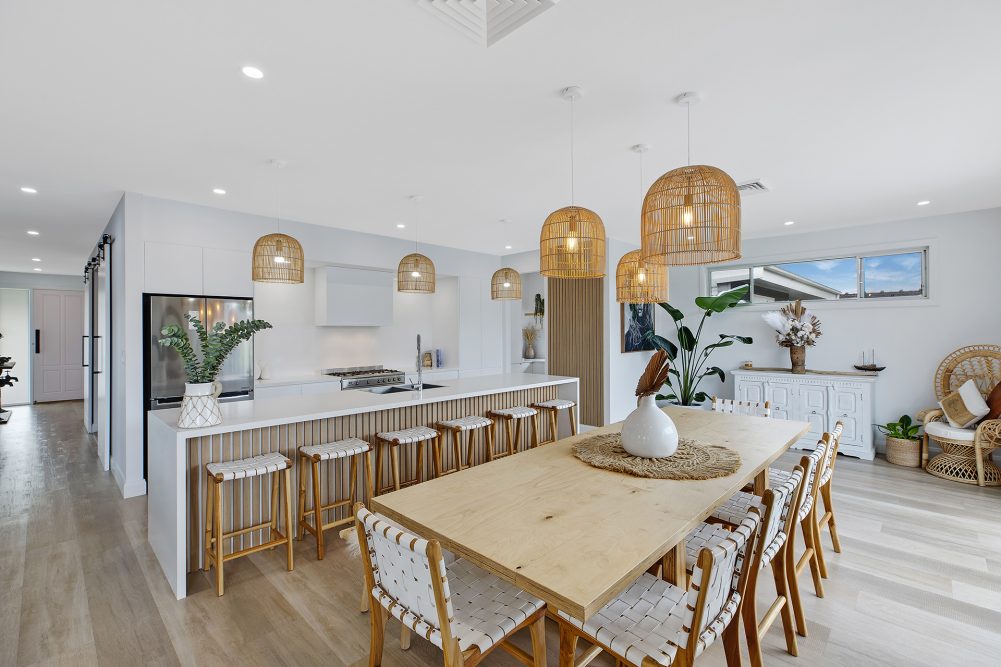 - A stunning and highly personalised family sanctuary that truly reflects the clients' vision. The home's Coastal Hamptons exterior, characterised by its crisp white facade, pitched rooflines, and inviting picket fence, creates an elegant street presence. Inside, the open-plan living areas flow seamlessly to a magnificent outdoor space featuring a covered alfresco dining area, a sparkling pool, and a fire pit zone – perfect for year-round enjoyment. Unique touches abound, including a meticulously designed garage for car enthusiasts, a stylish and practical home office upstairs, and a contemporary kitchen that serves as the heart of the home. Every detail, from the choice of rattan lighting to the custom bathroom finishes, was executed to perfection, resulting in a cohesive, luxurious, and highly livable home designed for making lasting family memories.